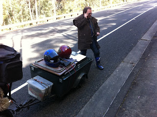 Dad and I took off for the Putty Road to head to Muswellbrook. It was a pleasant day for a ride. Fuelled up again at Windsor and the trailer started to feel a bit funny - Funny funny, not funny ha ha. We thought it just needed repacking.